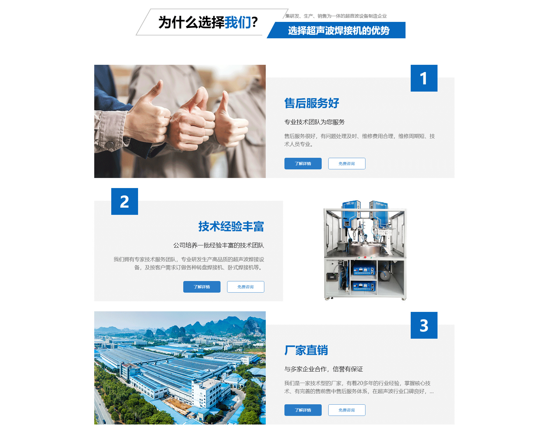 關于我們廈門勁榮機械設備有限公司是一家集研發(fā)、生產、銷售為一體的超音波設備制造企業,主要產品包括多規(guī)格型號的超音波塑膠熔接機、熱板式塑料焊接機、多工位轉盤焊接機、振動摩擦焊接機、旋轉式塑膠熔接機及配套的工裝夾具等。公司自2003年成立以來,一直致力于產品不斷完善中,并追求產品的精益求精,于2004年向國家商標局注冊了“勁榮”牌商標,2009年榮獲廈門市商標。 經過多年的努力,公司已經發(fā)展成為占地面積2000余平方米、擁有員工50余人的企業。公司一直將“品質是企業發(fā)展的原動力”作為經營理念,嚴把質量關,建立了一整套有效的安全生產及管理模式,不僅贏得了同行的認可,更取得了客戶的信賴,先后與九牧集團、路達工業、建霖集團、西伯電子、蒙發(fā)利實業、松霖科技、銥科集團、科司特電子等公司建立了長期的合作關系。 面對已經取得的成績,我們不驕不滿,因為深知業績只能代表過去,只有靠良好的產品質量和完善的售后服務才能在客戶中口碑相傳,在...